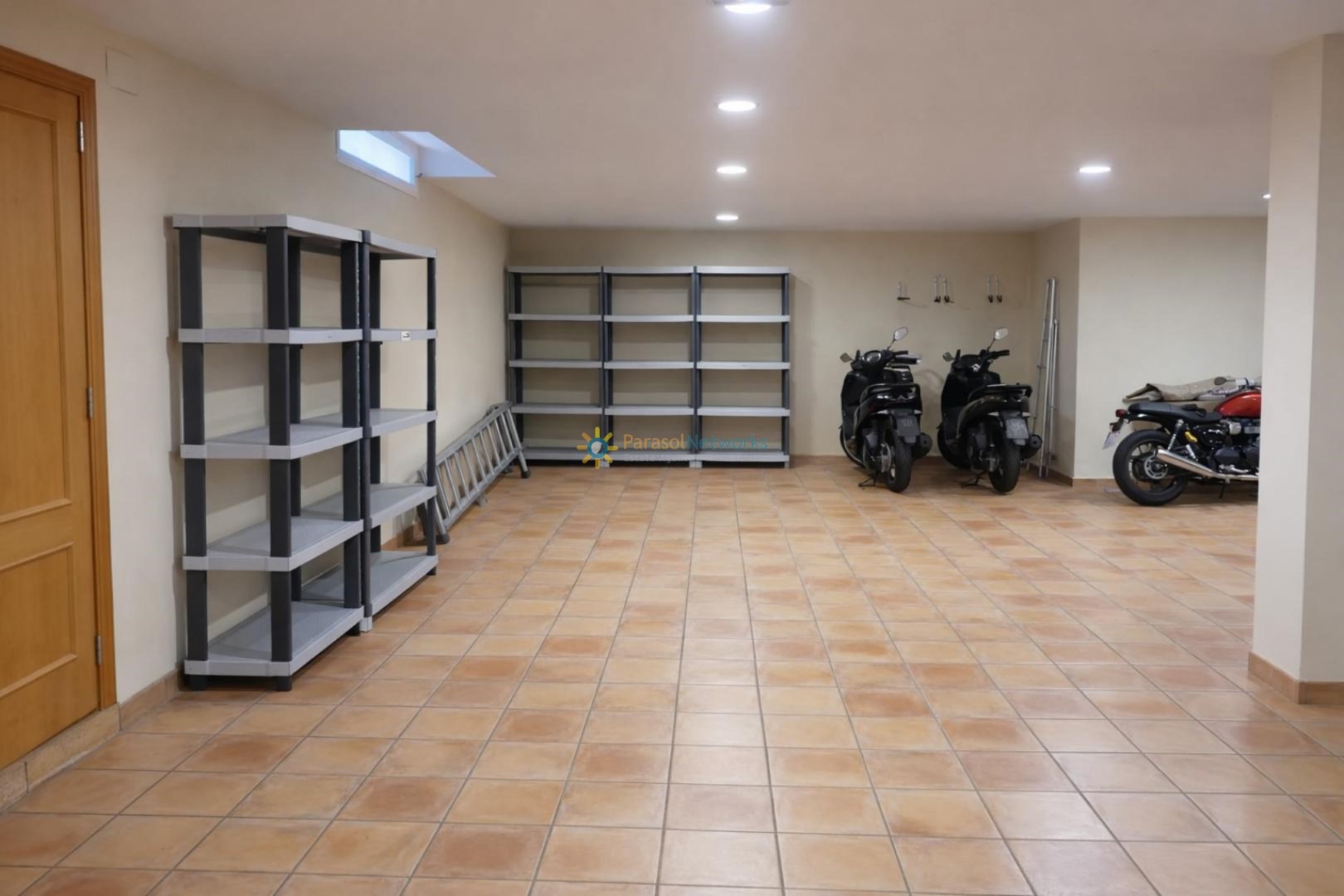 On the lower floor, there is a garage for two vehicles with a pumping system for cases of heavy rain, as well as a gymnasium, a space for tools and a storage room. From this floor, an elevator takes us to both the ground floor and the first floor.