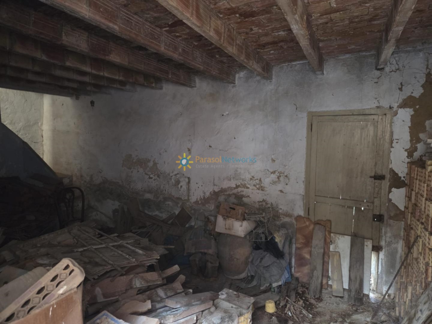 En la planta baja encontramos un recibidor, salón-comedor con chimenea, una cocina independiente, un dormitorio y un baño con bañera. Desde esta planta se accede a un patio interior, un trastero, que comunica con un terreno ajardinado y cultivable con salida directa a la calle trasera. Desde el trastero se accede también a un desván situado en la parte trasera de la primera planta de la vivienda.